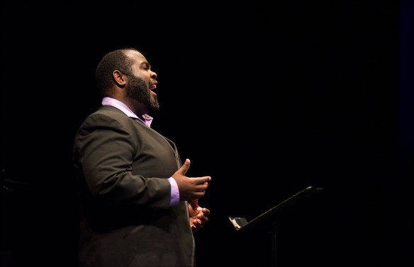 This was just the tip of the iceberg though. One of the great assets of the Monteverdi Choir is that its members are all potential soloists, making it a great team of individuals. Soprano Miriam Allan and bass Robert Davies dueted in the Aria and Chorale, and complemented each other very nicely, then tenor Hugo Hymas sang beautifully for the Recitative, while Mobley (above) once again impressed with his passionate and full-bodied tones in a duet with the tenor. The orchestra were once again on top form, though this time oboist Leo Duarte was keenly in focus, moving between the conventional wooden oboe, an oboe d’amore and an oboe di caccia (which looks rather like a banana!) with great dexterity and flair.